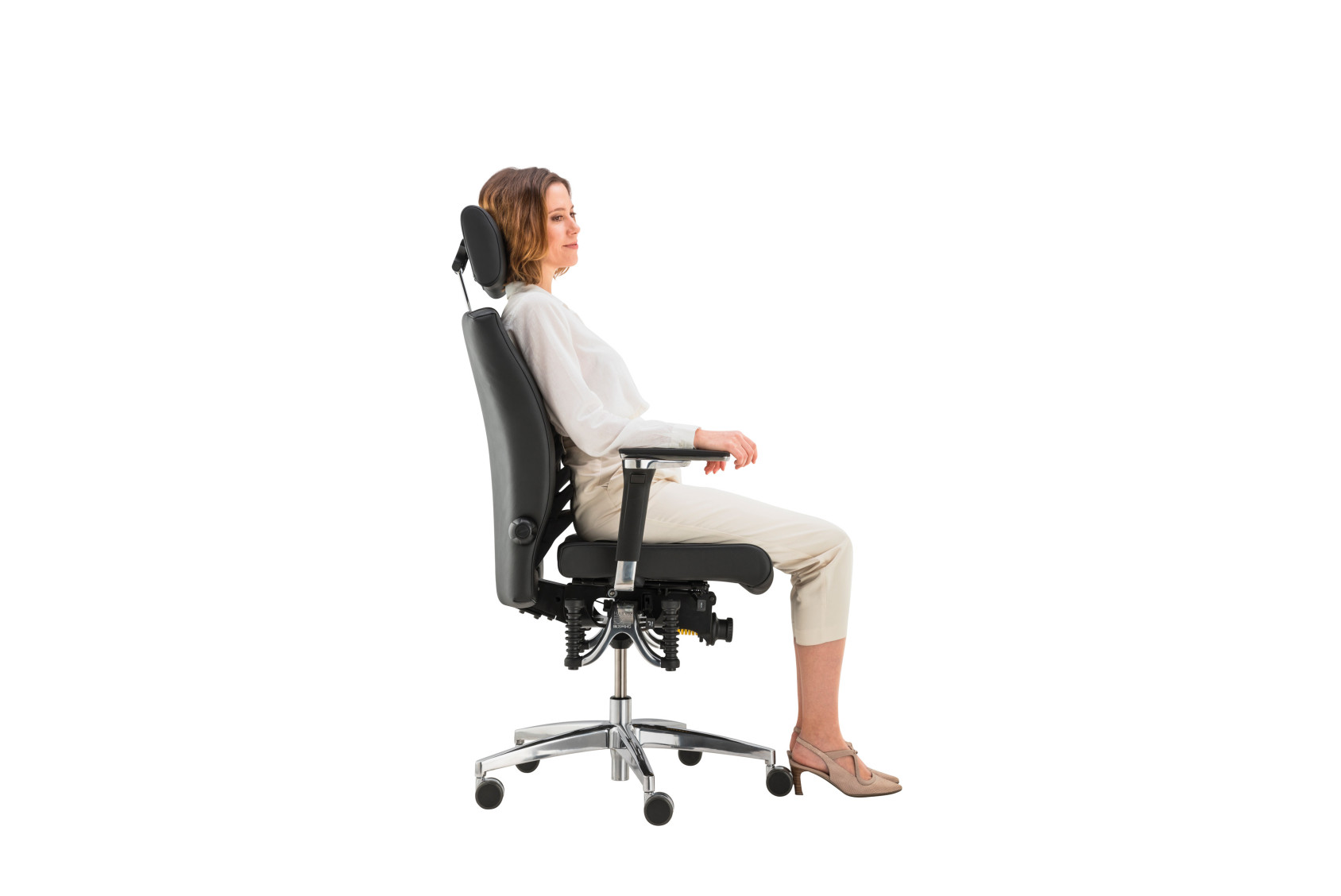 Der hochwertige Bezug Prestige M in M180 schwarz (Preisgruppe D) sorgt für edle Optik und Langlebigkeit. Sitzhöhe und -neigung lassen sich präzise per Gasfeder anpassen; die Sitztiefe regeln Sie über den Schiebeschlitten. Der Stuhl kommt ohne Beckenbalance und fokussiert auf ruhige, stabile Unterstützung.