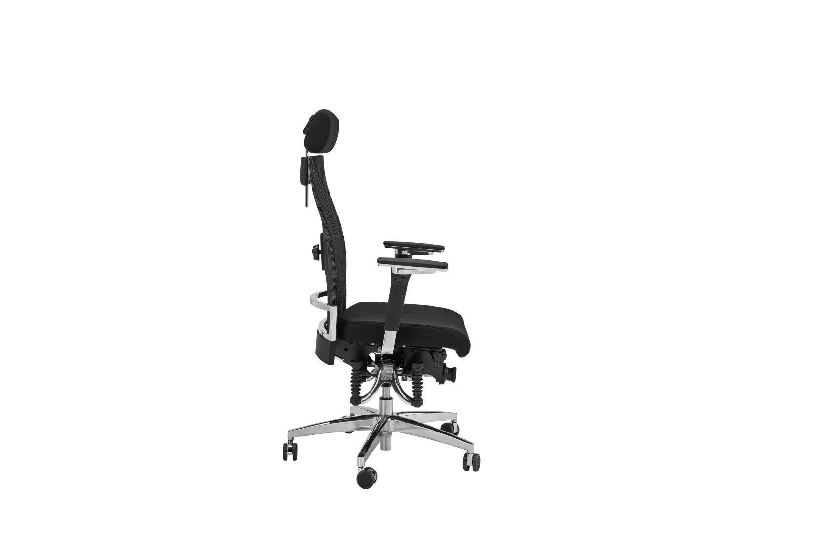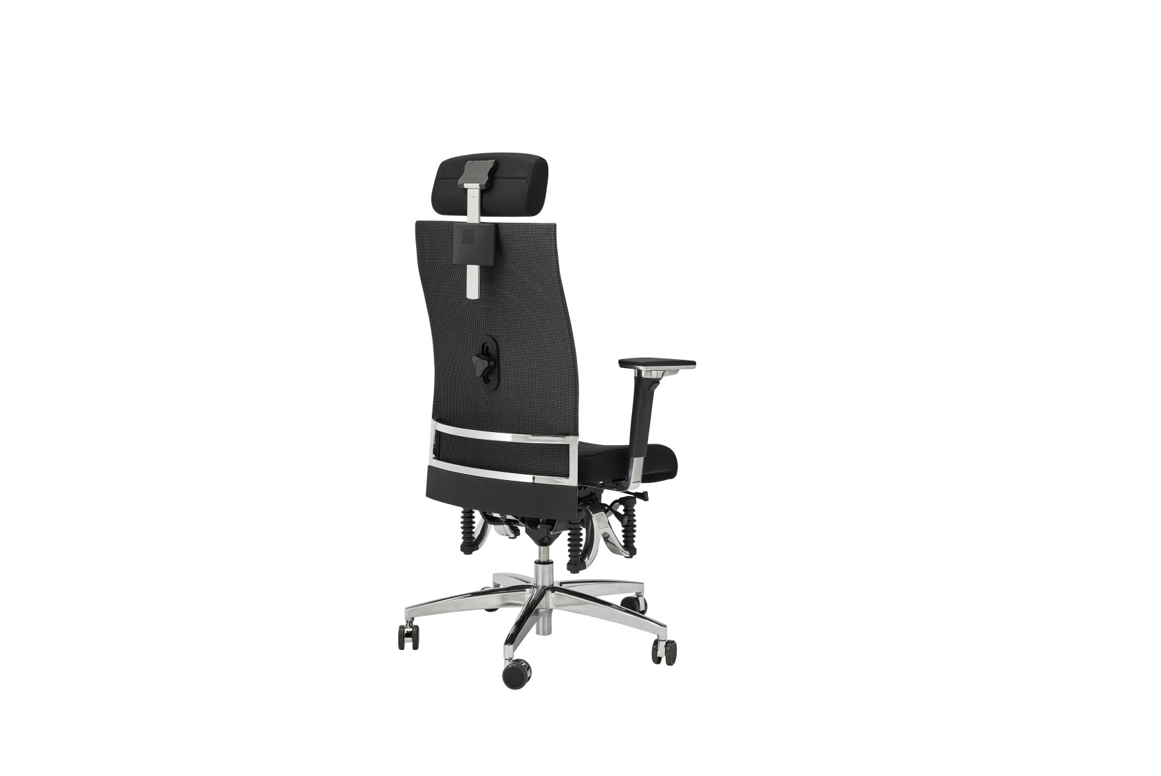 Der Sitzbezug besteht aus dem strapazierfähigen Stoff Step in 60999 schwarz (Preisgruppe B). Das polierte Aluminium-Fußkreuz mit Ø 68 cm sorgt für Stabilität; weiche Chromrollen (6 cm) gewährleisten leises, bodenschonendes Gleiten.
