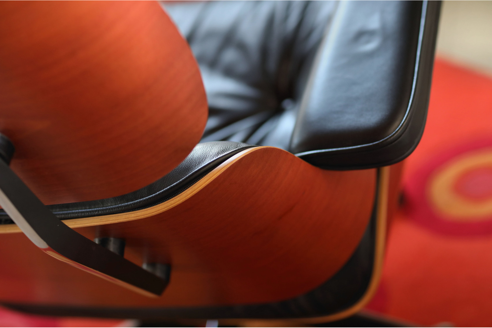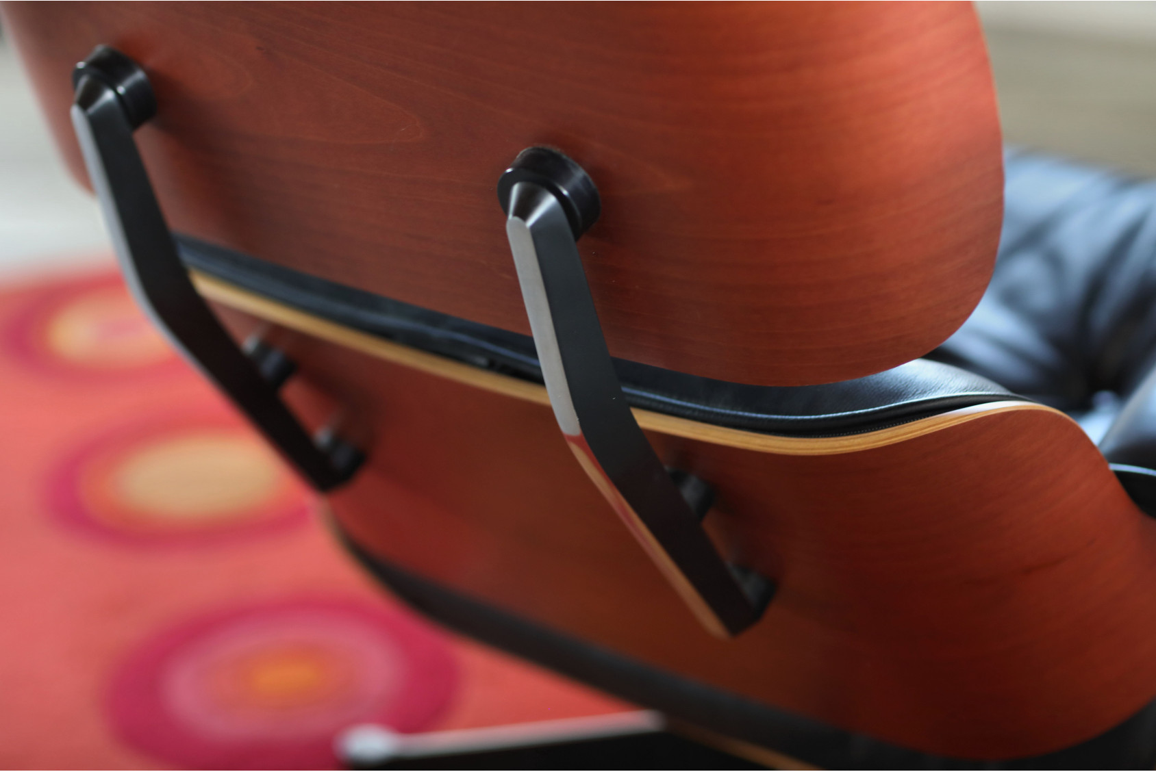 Das Schaumstoff-Inlay sorgt für ein angenehmes Sitzgefühl, während die Aluminiumteile von Fuß und Rückenbügel aufwendig poliert wurden. Der Fuß ist mit schwarzen Seiten und polierten Aluminiumflächen ausgeführt und rundet das elegante Gesamtbild ab. Dieser Eames Lounge Chair verbindet ikonisches Mid-Century-Design mit der modernen Qualität von Vitra – ein Highlight für Designliebhaber und Sammler.