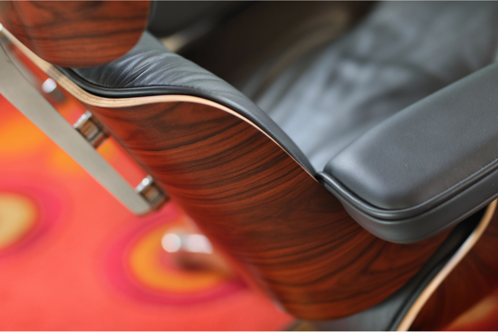 Der Charles & Ray Eames Lounge Chair von Vitra in der aktuellen Ausführung (Baujahr 2024) verbindet das ikonische Mid-Century-Design mit modernster Fertigung. Die Schalen aus Santos-Palisander im Originallack zeichnen sich durch eine besonders lebendige Maserung aus, die diesem Stück Individualität und Ausdrucksstärke verleiht. Das originale schwarze Leder und das Schaumstoff-Inlay bieten höchsten Sitzkomfort bei edler Optik.